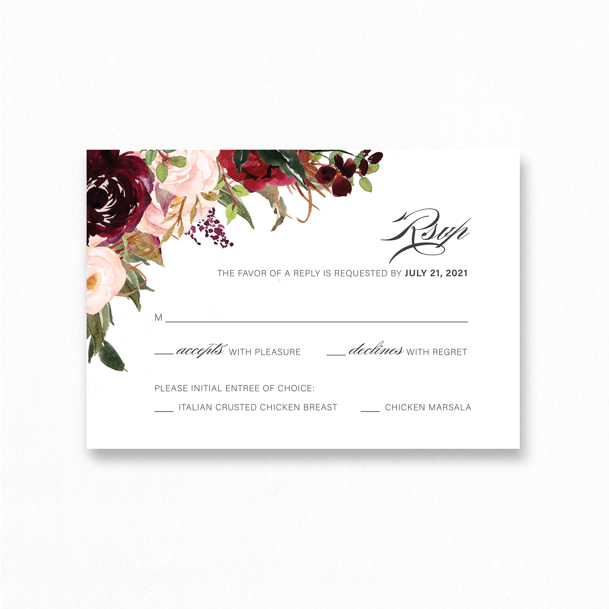 - RSVP Card Size: 5″ x 3.5″ vertical or horizontal orientation available