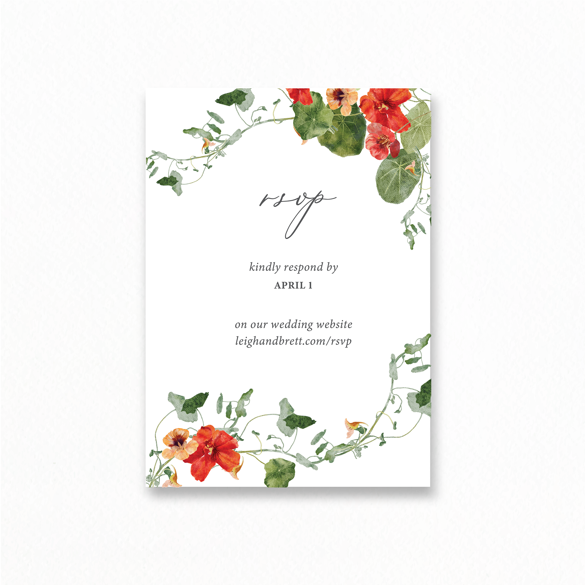 - RSVP Card Size: 5″ x 3.5″ vertical or horizontal orientation available